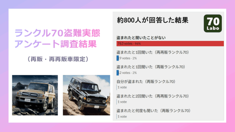 WELCOME to LC70.labo 検索: カテゴリーカテゴリー カテゴリーを選択 950登録(牽引) (2) Article in English (5) DIY (146) FOR SALE & WANTED (70) FORSALE(売却済み) (96) FORSALE(販売中) (18) WANTED(購入希望) (8) アンケート調査 (14) イベント情報 (16) いろいろ試乗 (1) オーナーリスト (56) オフロード&林道 (72) カスタム (103) キャンプ (9) クラッチ (1) ジムニーシエラ購入記 (17) トライトン (1) ナロー化 (3) パーツリスト (18) バン荷台カスタム (6) ピックアップ荷台カスタム (3) ホイール・タイヤ系 (73) メンテナンス関連 (106) ラジコン (2) ランクル70クイズ (59) ランクル70基礎知識 (4) リフトアップ (19) リンク集 (1) レカロシート情報 (6) 不便解消系カスタム (24) 中古車情報 (62) 乗り心地改善系カスタム (28) 事故 (4) 再再販関連情報 (150) 再販ランクル70色々 (62) 動画 (6) 各種調査 (18) 合わせ技カスタム (6) 吸排気系カスタム (14) 報道・CM・マスコミ (24) 夏オススメ (8) 外装系カスタム (94) 室内系カスタム (54) 所長のDIY (93) 所長の日記 (91) 新着 (7) 構造変更 (2) 燃費情報 (56) 疑問?質問? (24) 盗難対策 (5) 継続検査 (9) 維持費・保険 (11) 車検情報 (19) 車検証・カタログなど (31) 防錆コーティング (6) 電装系カスタム (55) 音響系カスタム (11) ご訪問ありがとうございます。当研究所はランクル70オーナー(所長)が運営中。ランクル70を楽しむため、カスタム、メンテナンス、中古車情報などを共有しています。閲覧時は下記ご了承下さい。当サイト内容の転載、複製、改変は禁止です。快適な閲覧・運営のため、品位を欠くコメント(誹謗中傷、挨拶なし、他者批判、強要等。運営者が判断します)は受け付けません。本サイトで紹介するパーツ等にはプロモーションを含みます。 New Articles96%が聞いた事もない?ランクル70盗難実績アンケート結果2026年3月24日ランクルFJ約630万円で発売inタイ。日本で400万円台はホントか?2026年3月22日悲報!2025年盗難実績でランクルが突出!2026年3月4日ランクル80、100、このままの顔じゃダメですか?2026年3月3日ランクル70盗難実態調査(アンケートご協力のお願い)2026年3月2日ランクル70世代交代を満喫しつつ50周年記念モデルを待つかな2026年2月22日シュノーケルと車検の気になる関係?2026年2月20日新エアコンプレッサーでランクル70緊急タイヤ交換2026年2月20日再再販ランクル70に無難に適合する夏タイヤ&ホイールセット(2026年版)2026年2月18日再販ランクル70にヘッドライトウォッシャー後付けDIY2026年2月12日再販ランクル70のユーザー車検終了!2026年2月9日再販ランクル70の燃費記録 2026/2/8UP2026年2月8日もうランクルFJ予約?発売日•価格は?2026年2月4日プラドはランクル?2026年1月31日再再販ランクル70のヘッドライトの雪対策教えて!~融雪ヒーター~2026年1月19日再再販ランクル70の生産台数調査2026年1月11日もう11年目。再販ランクル70の劣化は?2025年12月31日危うくランクル70もどき。4WDにならない!たまには四駆&デフロックは大事。2025年12月30日再販ランクル70の燃費記録 2025/12/28UP2025年12月28日再再販風ヘッドライト&ハンドル革巻きカスタム by Gomezさん2025年12月15日12345›» Custom Parts再再販ランクル70に無難に適合する夏タイヤ&ホイールセット(2026年版)2025-2026 再再販ランクル70(GRJ76&79・GDJ76等)適合スタッドレスタイヤランクル70にも10インチナビ?ブレーキペダルロックでランクル盗難からのナイスディフェンス!再再販ランクル70に無難に適合する夏タイヤ(2025年版)ランクル70専用設計スマホホルダーあるんだね再再販ランクル70のレカロシートレール適合情報2024-2025 ランクル70(GRJ76&79・GDJ76)適合スタッドレスタイヤ調査123 Popular Articles後悔するな!再再販ランクル70を「買わない理由」再販ランクル70のダミーテール4灯化カスタムDIY(車検はNG?)再販ランクル70カタログ(本冊)2014.8再再販ランクル70が一部で受注再開の模様だが・・・再再販ランクル70(GDJ76 )リアシート後方移動ステー情報 by tn218さん全幅を比較→ランクル70はデカくて迷惑な車?丸山モリブデン情報 ~「エンジンを壊す」デメリットの噂の真偽は?~ランクル70荷台ベッドDIY情報(設計図有) byあぜまるさんランクル70維持費の実額は?(自動車税 自動車保険 車検費用等)ランクル70のH4(ハイレンジ4WD)の使い方は?ホワイトレターを消す方法はあるのか?(BF Goodrich編)ホイールからタイヤをDIYで外した方法 16インチ 265/70R16 LC70.Labo Members再再販ランクル70オーナー1名エントリー!(No.458 YP嫁さん)2025年9月30日再再販ランクル70オーナー1名エントリー!(No.612 明日やろうは馬鹿野郎さん)2025年9月12日再再販ランクル70オーナー1名エントリー!(No.457 ゆっきーさん)2025年2月15日再再販ランクル70納車&カスタム報告 by にゃもさん(Entry No.412)2024年12月22日12345›» BLOGランクル80、100、このままの顔じゃダメですか?2026年3月3日ランクル70世代交代を満喫しつつ50周年記念モデルを待つかな2026年2月22日新型ハイラックスとMotor Expo2025 Bangkokで初対面2025年11月29日まさかのランクル40 in タイ Stumbled Upon a Land Cruiser 40 Pickup in Bangkok2025年6月27日12345›» For Sale【FOR SALE】ランクル77&76 純正リアシャック