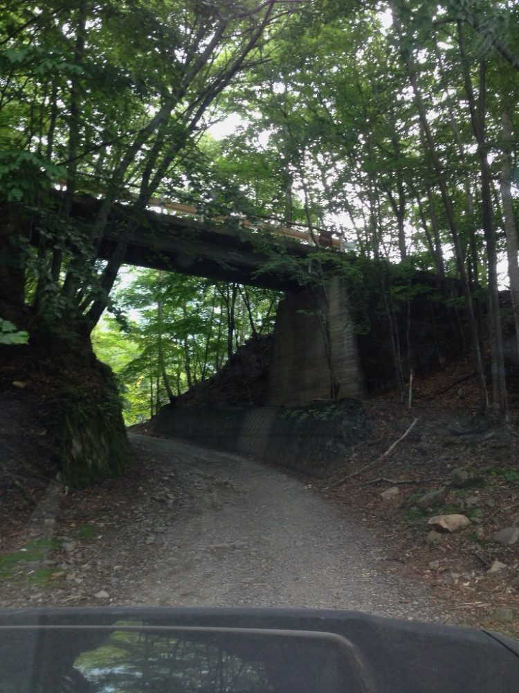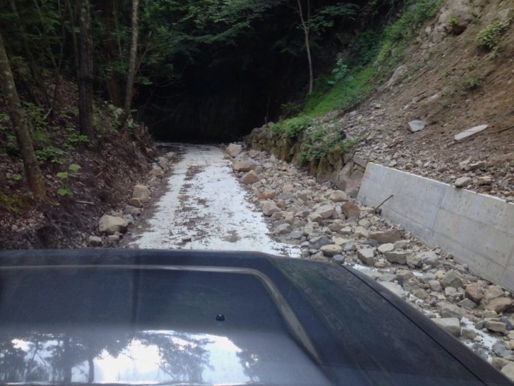 以前の栗原川林道で見た動物除けの門扉がありそれを開けて入るといきなり数十mの道路上に土砂が崩れた跡があったり、倒木を車が通れるだけ切り取った木があったり、落石をちょこっとどかしただけの路面があったりで思いのほかハードな結果になりました。