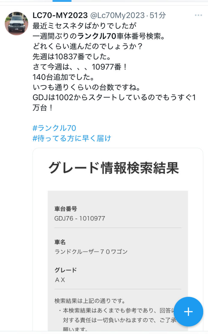 この情報によると、これまでのところ生産された再再販ランクル70の台数は約10000台。この1週間に140台増えたそう。