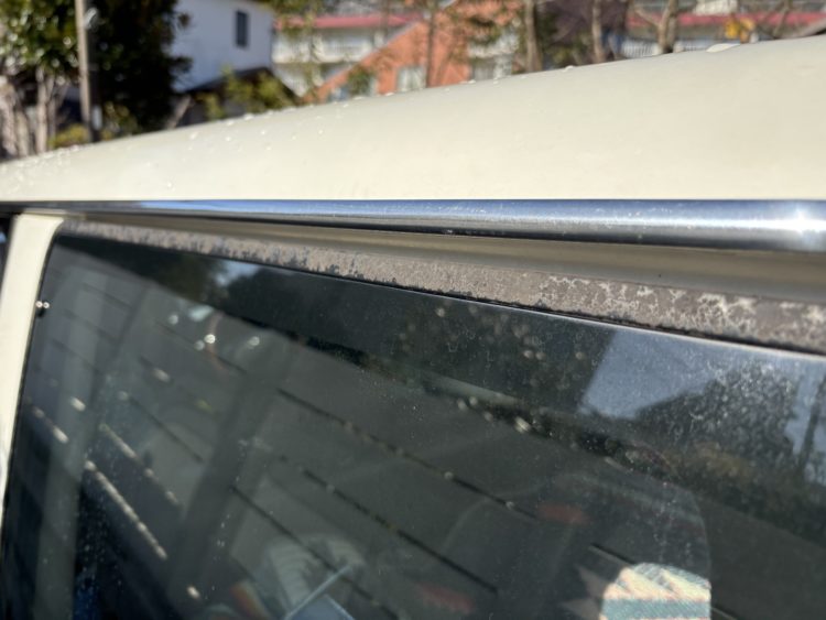 最初に目に留まったのは、リア(荷室)サイドのガラス枠部分の劣化。