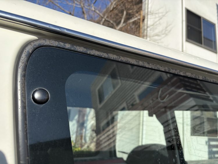 最初に目に留まったのは、リア(荷室)サイドのガラス枠部分の劣化。