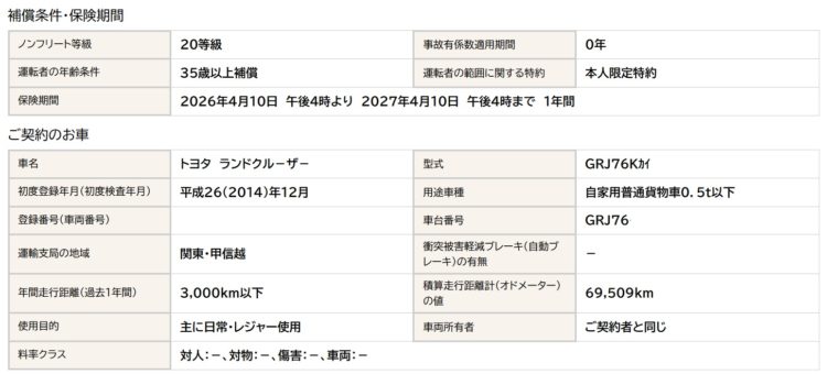 愛車、再販ランクル70(GRJ76K)の自動車保険(任意保険)の更新時期が来た。